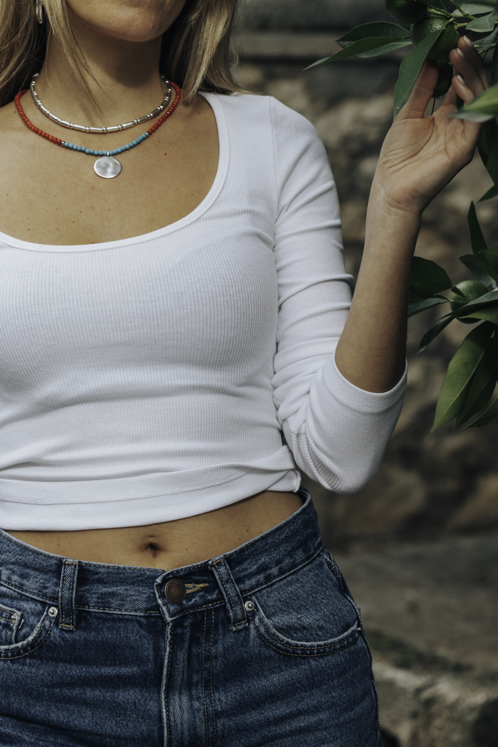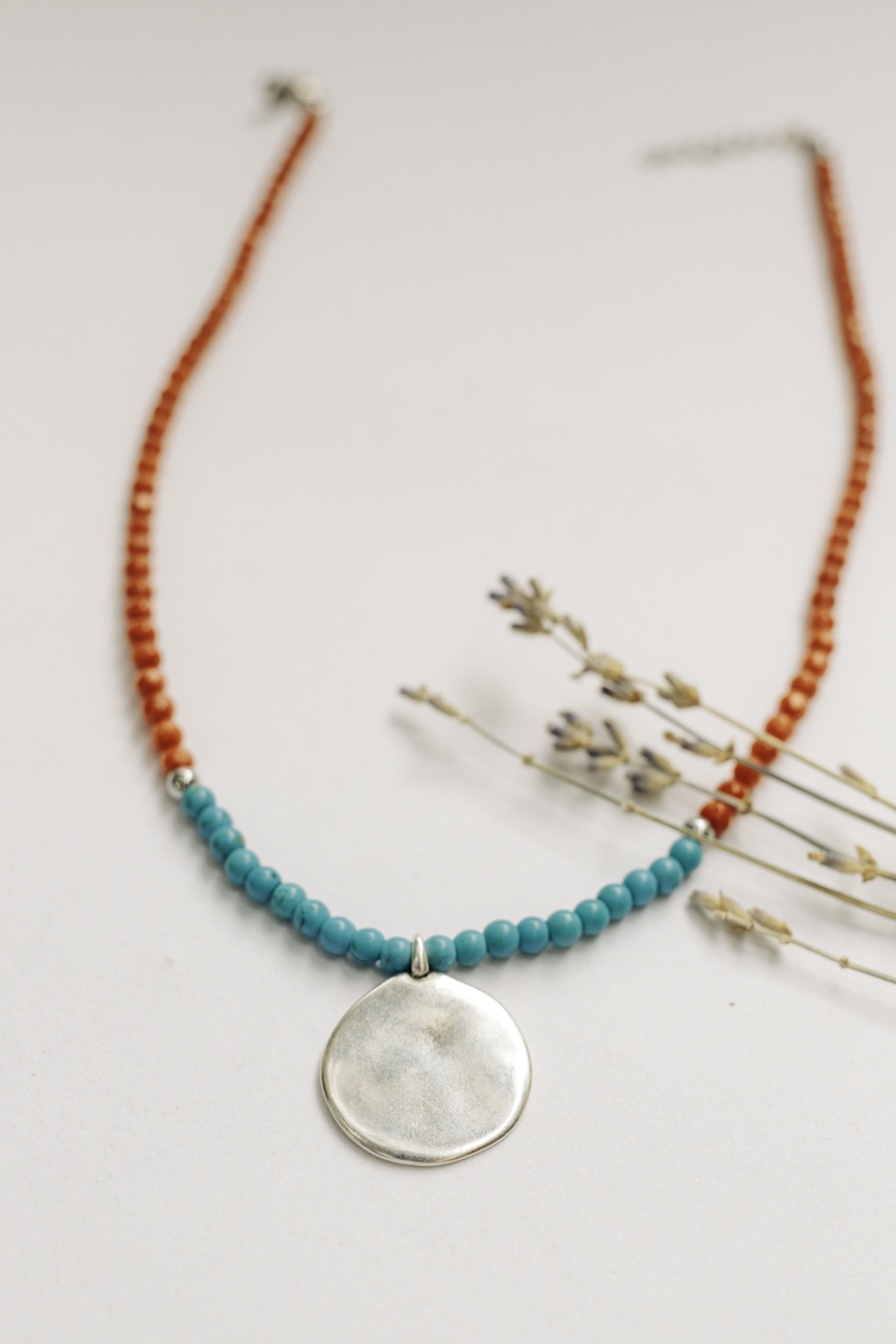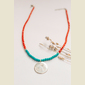 •Υλικό :Κολιέ με χάντρες από κοράλι,τιρκουαζ χαολίτη κ επάργυρα στοιχεία